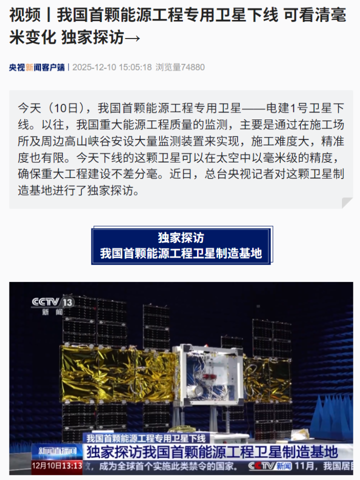 IT之家12月10日消息,据央视新闻报道,我国首颗能源工程专用卫星——电建1号卫星于今日下线。